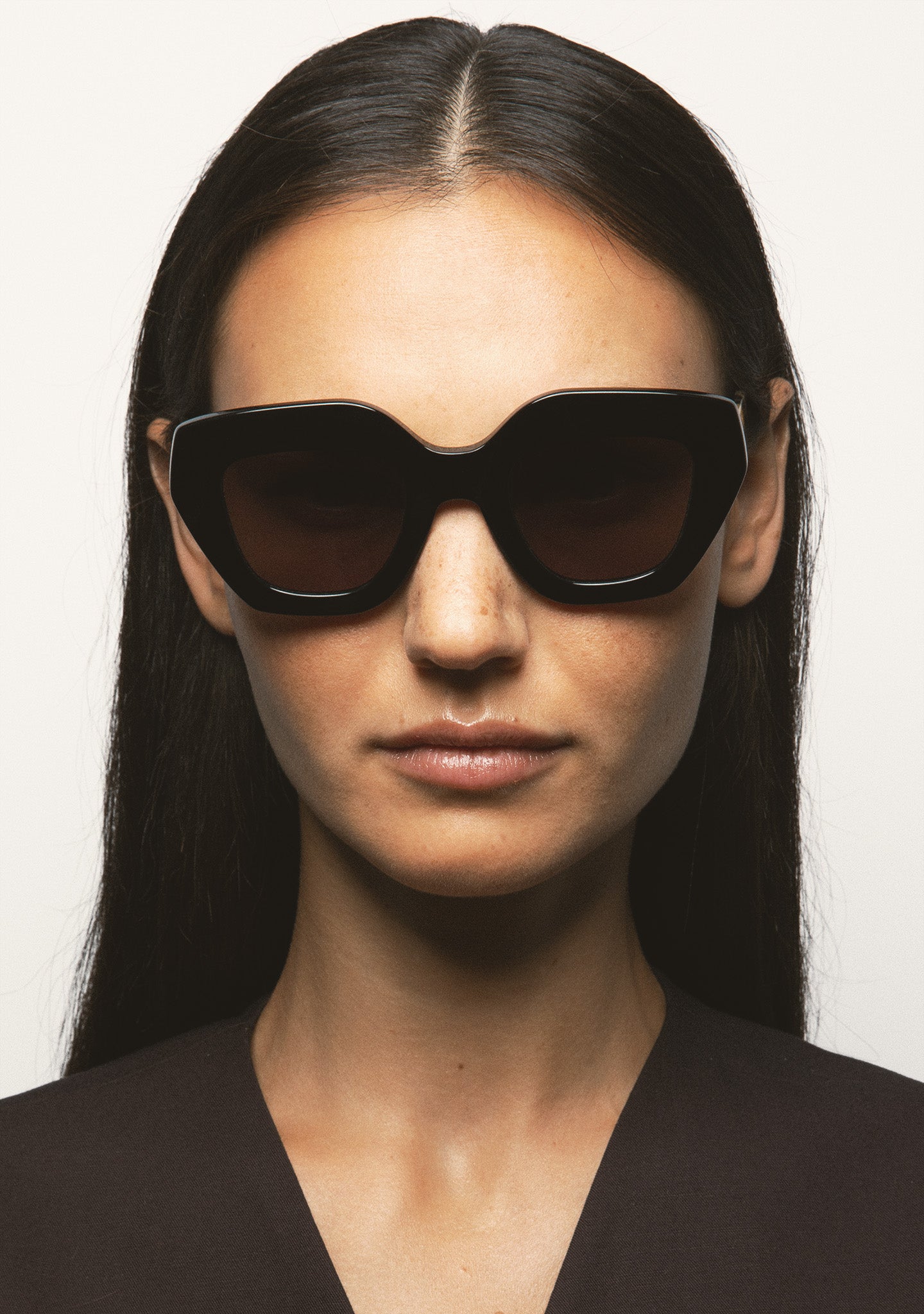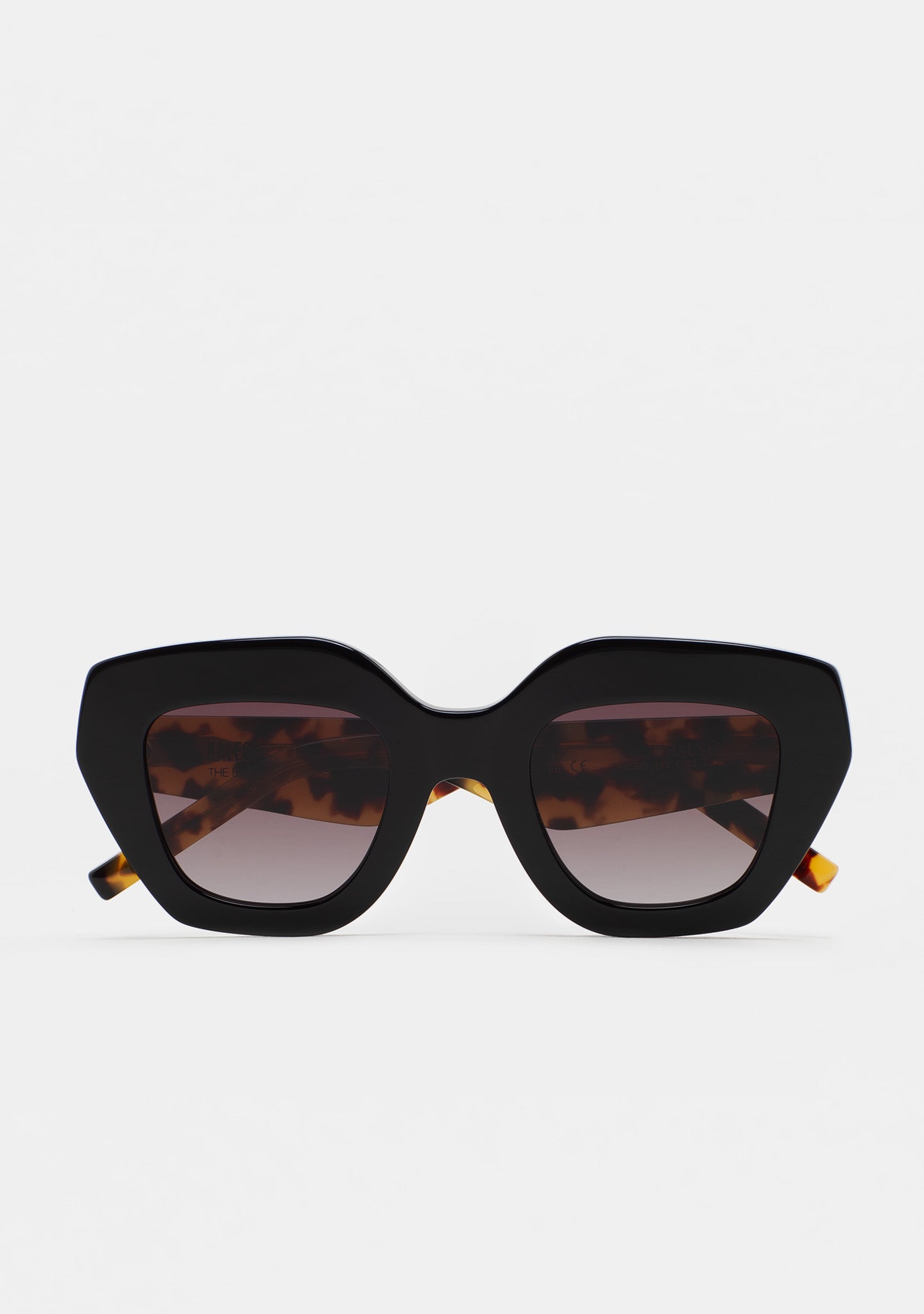 Occhiali da sole di forma farfalla. Frontale in acetato nero e aste in acetato havana marrone. Lente grigia degradé base 2 con protezione UV 100% e trattamento antiriflesso. Lente Categoria 3. Plaquettes in acetato incorporate. Fatto a mano.