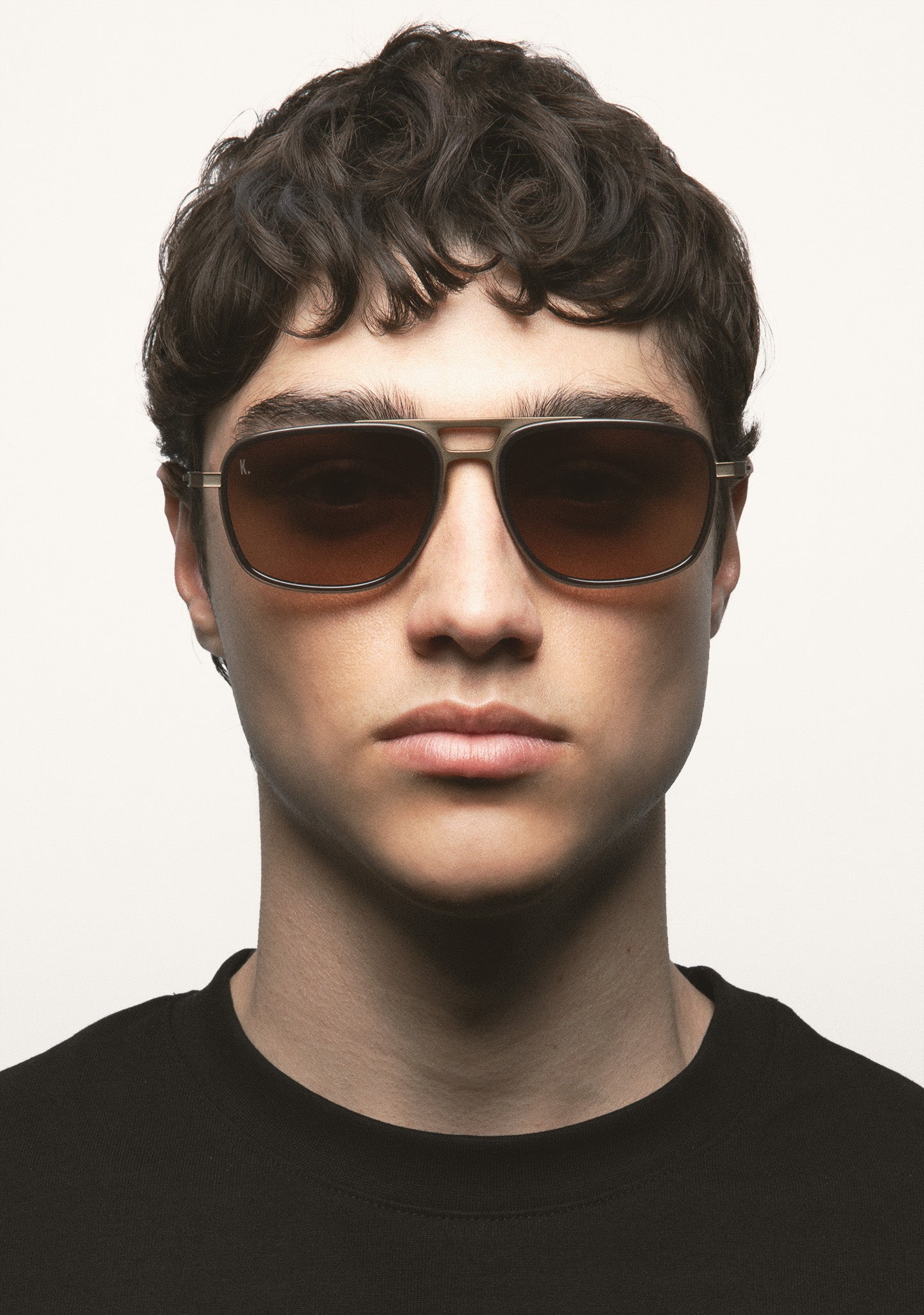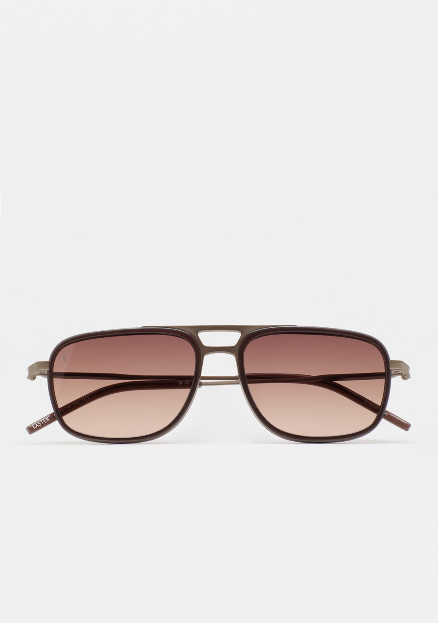Occhiali da sole di forma rettangolare con doppio ponte. Frontale in titanio marrone con cerchiatura in acetato high density marrone traslucido. Aste e ponte in titanio marrone. Aste con terminale in acetato marrone traslucido. Lente marrone sfumata base 2 con protezione UV 100% e trattamento antiriflesso. Lente categoria 3. Plaquettes in acetato incorporate. Fatto a mano.