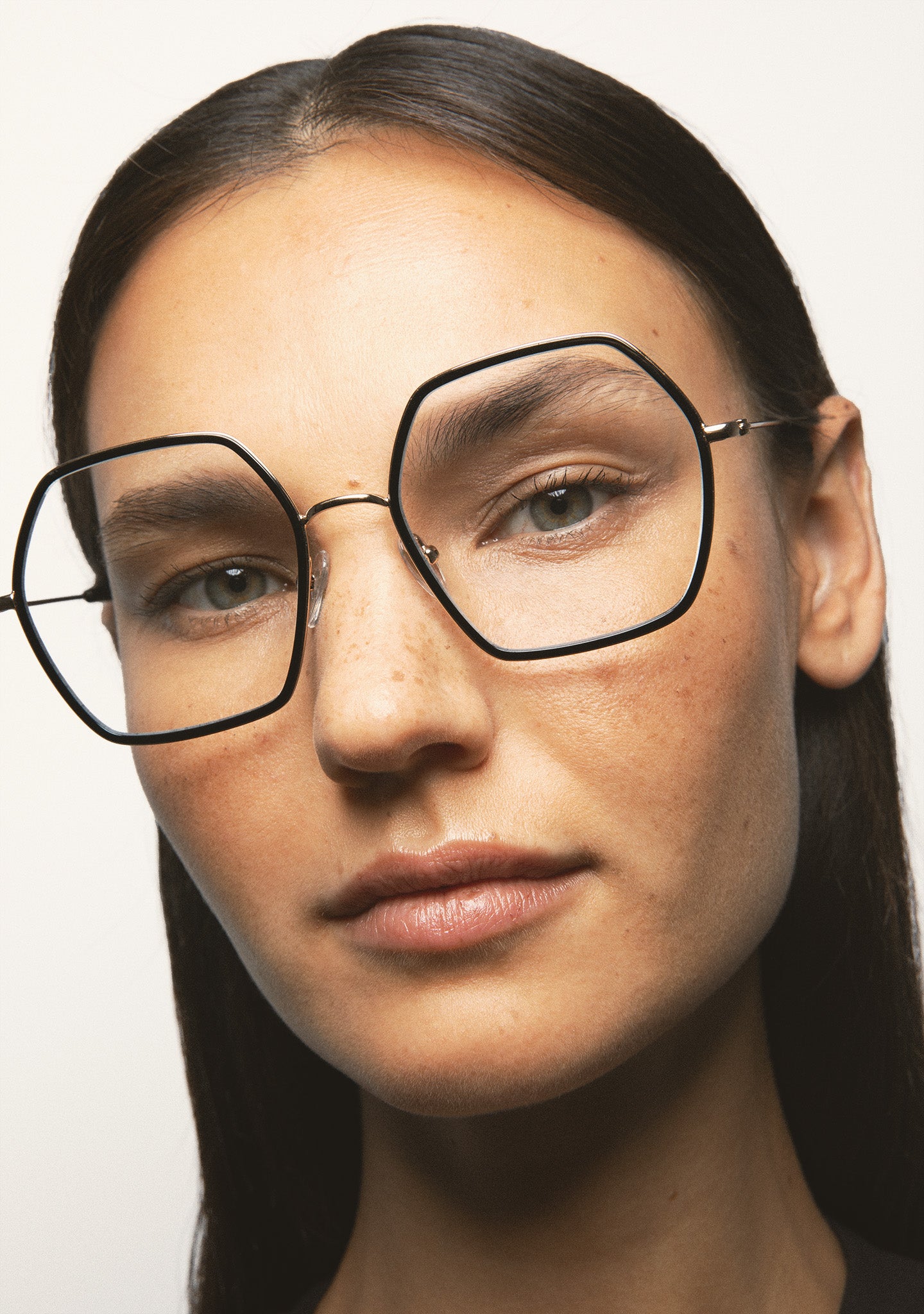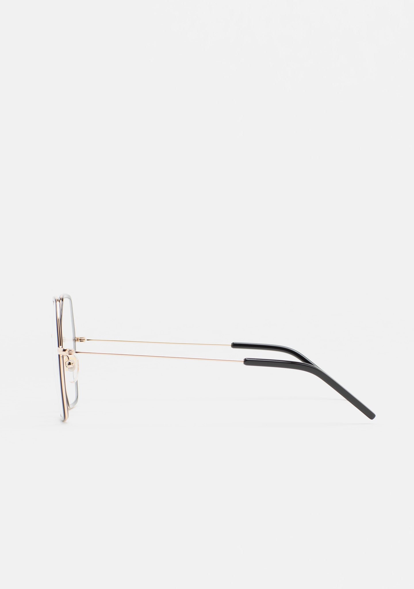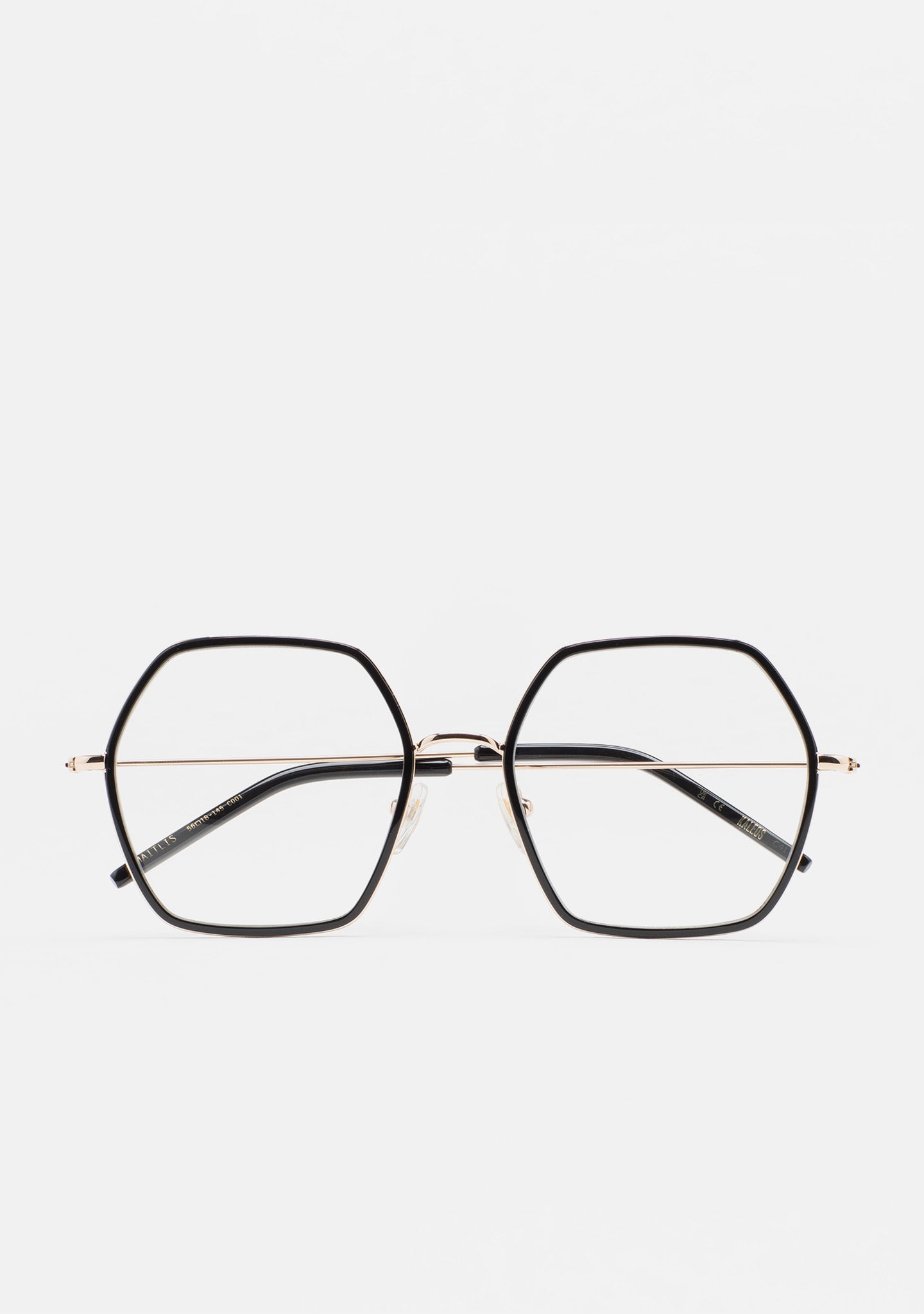 Occhiali da vista esagonali. Frontale in struttura in acciaio inossidabile dorato con cerchiatura interna in acetato high density nero. Ponte e aste in acciaio inossidabile dorato. Aste con terminali in acetato nero. Plaquettes in acetato incorporate. Fatto a mano.