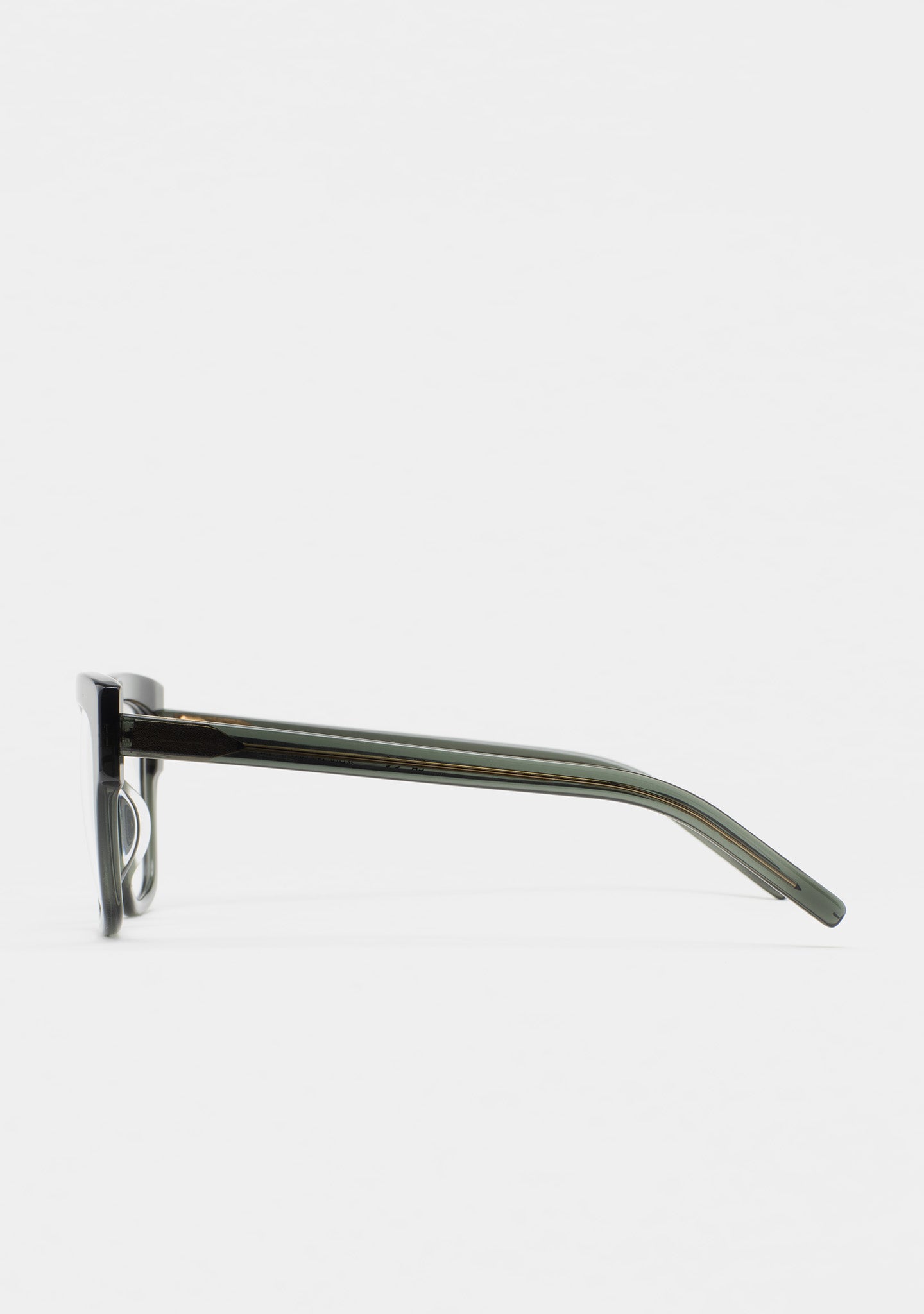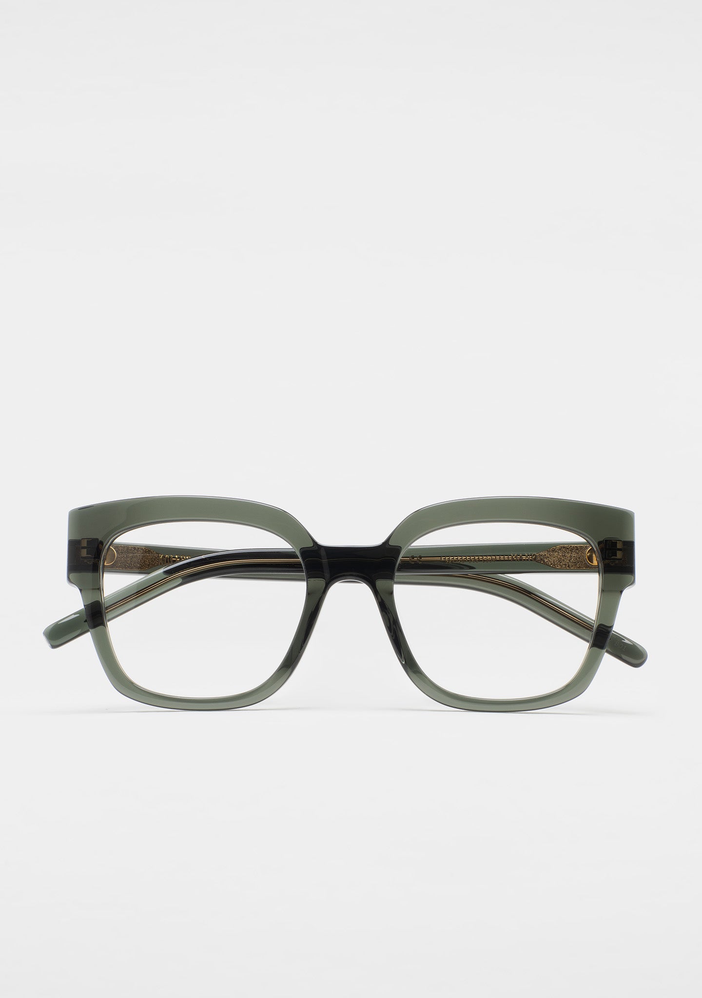 Occhiali da vista di forma quadrata. Frontale e aste in acetato verde traslucido. Plaquettes in acetato incorporate. Fatto a mano.