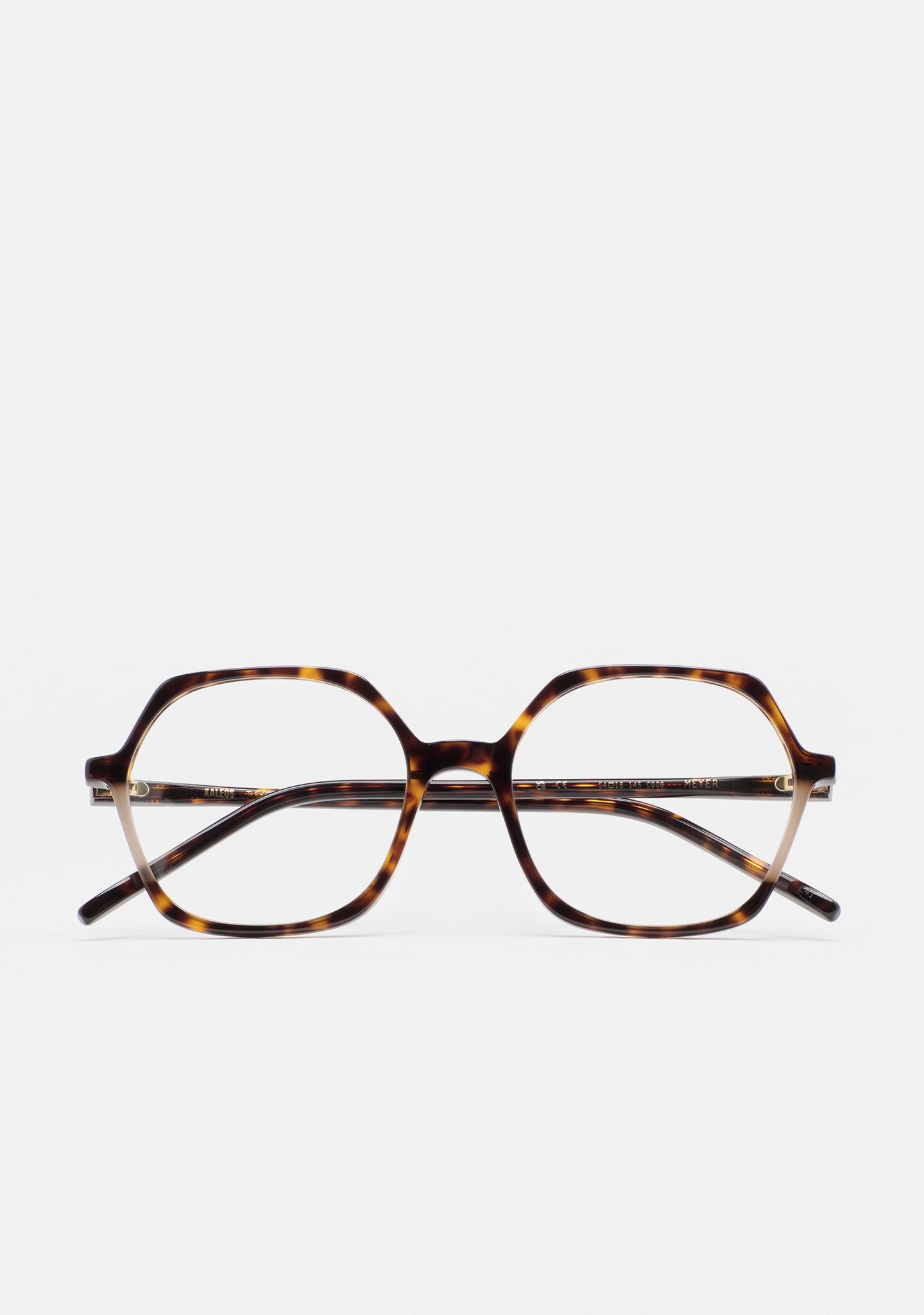 Occhiale da vista forma esagonale. Frontale in acetato high density havana marrone scuro con laminatura marrone chiaro trasparente. Aste in acetato havana marrone scuro. Plaquettes in acetato incorporate. Fatto a mano.